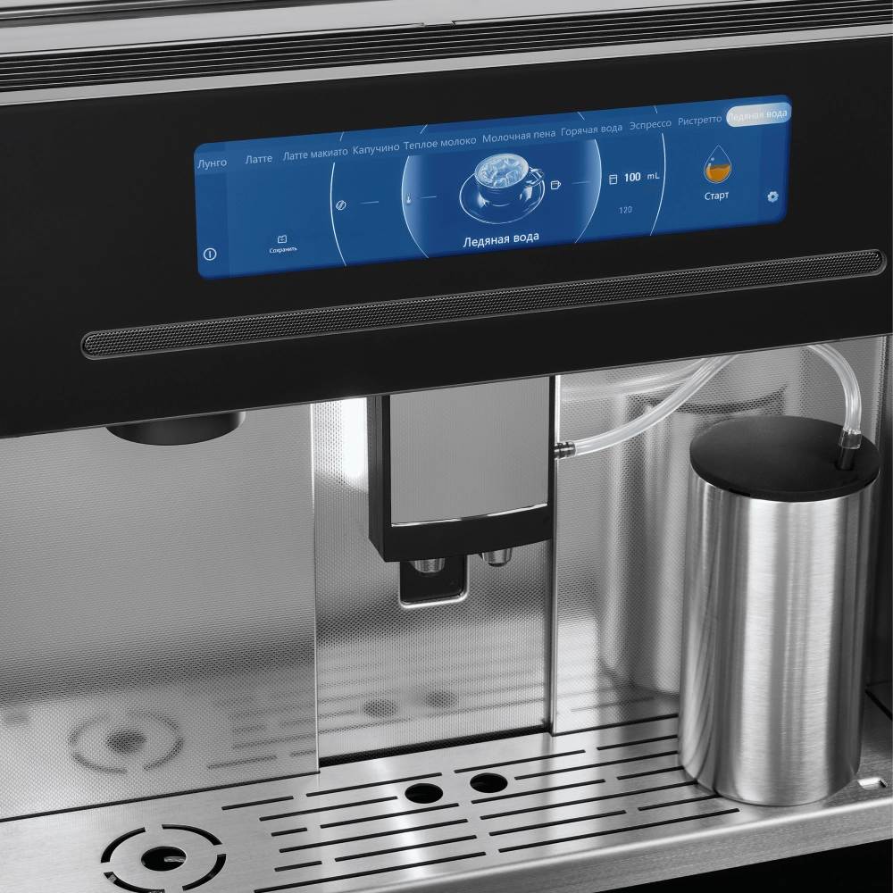 Кофемашина оснащена интеллектуальными функциями: автоматически промывает систему, оповещает о необходимости декальцинации и переходит в энергосберегающий режим с автоотключением.